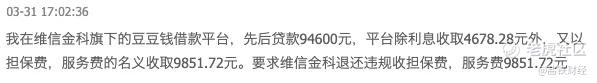 3月31日,一名用户就反映,其在维信金科旗下的豆豆钱借款平台先后贷款94600元,平台除利息收取4678.28元外,又以担保费、服务费的名义收取9851.72元。按照这名用户提供的数据,其被收取的担保费和服务费之和是利息的两倍还要多。
