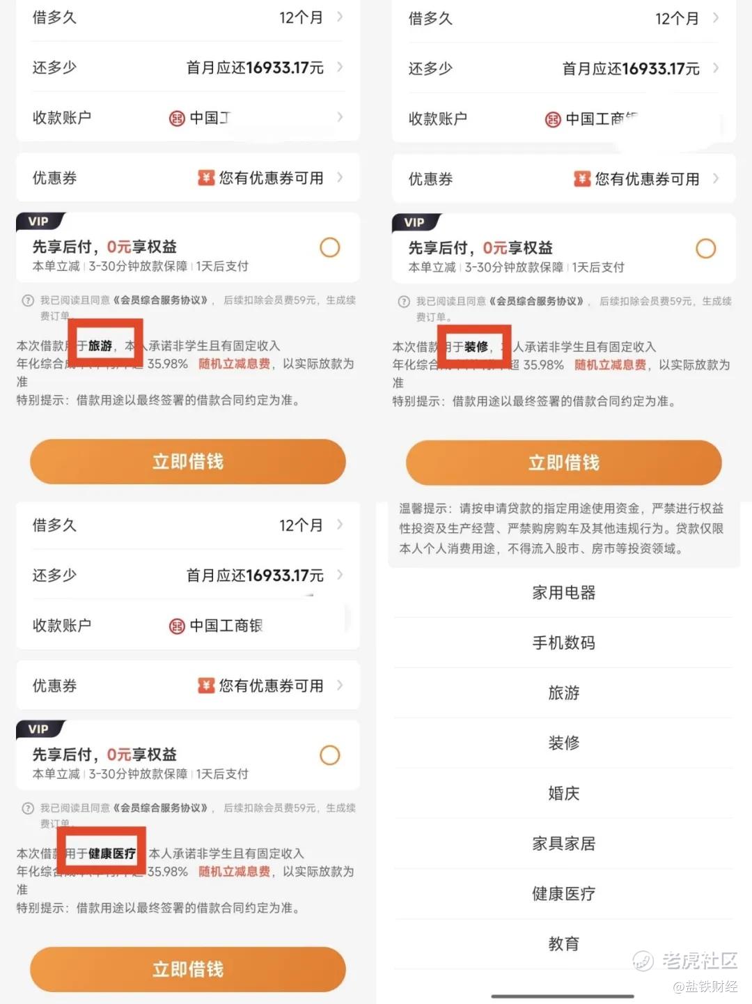 另一方面,如果借款人没有注意到这行小字,那么贷款用途则被默认选择。但这种默认并不是一成不变的,盐铁财经多次退出App又进入发现,“某某”在“旅游”“家用电器”“手机数码”“装修”“婚庆”“家具家居”“健康医疗”和“教育”之间不断变化。