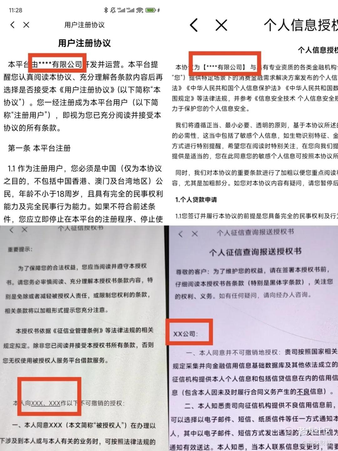 另一方面,因为借款协议中,借款人需要提供大量包括身份信息、账户信息、财产信息以及家庭成员信息等方面的隐私信息,层层授权后,极有可能面临信息泄露的风险。而部分第三方在用户协议中模糊数据共享条款,也会导致用户信息被用于精准营销或其他商业目的,导致个人隐私被过度商业化。