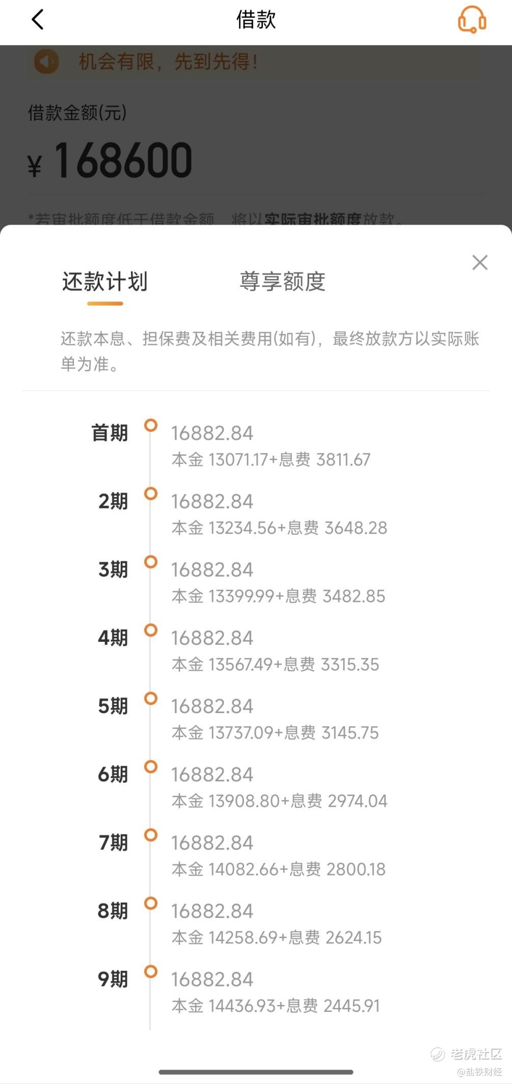 盐铁财经也下载了豆豆钱App测试,提交了包括姓名、身份证号和收款账户等个人信息后,其提供的借款金额为168600元,App界面提示,这笔金额按照12期来还,还款计划为每期还款16882.84元,计算下来,盐铁财经所承担的年化借贷成本同样为35.9%。不知这是否意味着,前面8%的利率只是个噱头,只能“可望而不可得”。