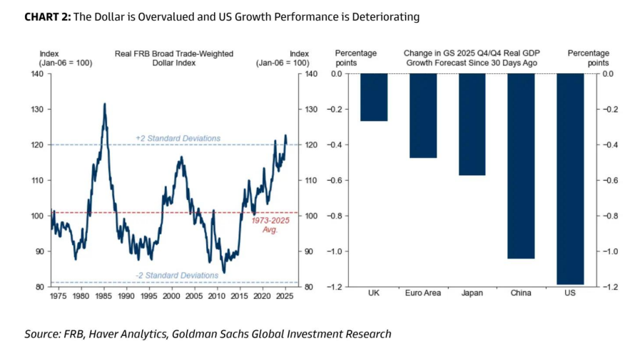 (左边为实际广义贸易加权美元指数,右边为高盛对 2025 年四季度同比实际 GDP 增长预测的变化)