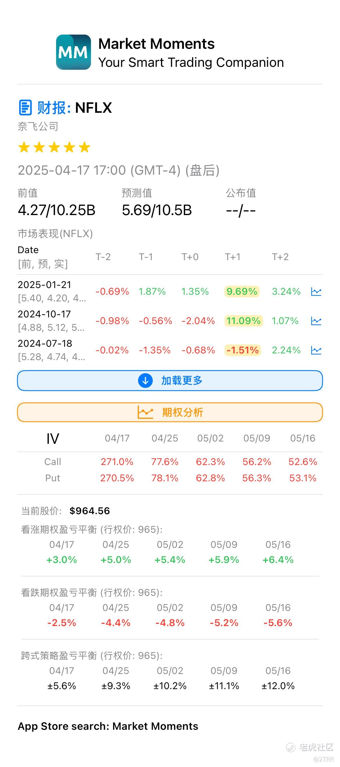 $NFLX, 今晚盘后发布财报,财报发布后历史波动剧烈,当前隐含波动率处于合理区间,或许可以考虑Straddle策略。