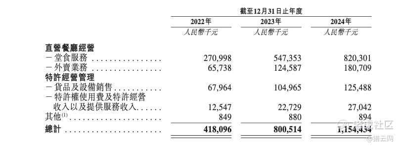 公司收入由2022年的4.181亿元增加至2023年的8.005亿元,并于2024年进一步增加至11.544亿元,年复合增长率为66.2%,而其收入主要来自直营餐厅经营及特许经营管理,走的是直营为主、特许经营为辅的路线。