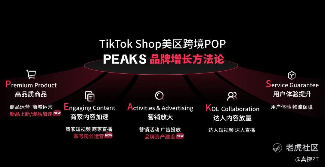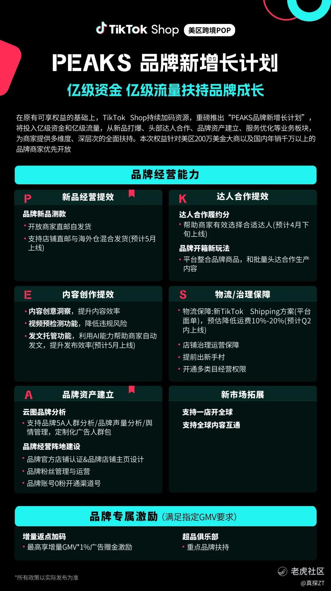 近日,TikTok Shop作为平台生态,就推出了“PEAKS品牌新增长计划”,投入亿级资金、亿级流量从新品打爆、头部达人合作、品牌资产建立、服务优化等业务板块,为商家提供多维度、深层次的全面扶持。在品牌广告投放、品牌营销活动方面,TikTok Shop还特别提供了“增量返点加码、超品俱乐部” 等专属权益,帮助品牌降本增效。