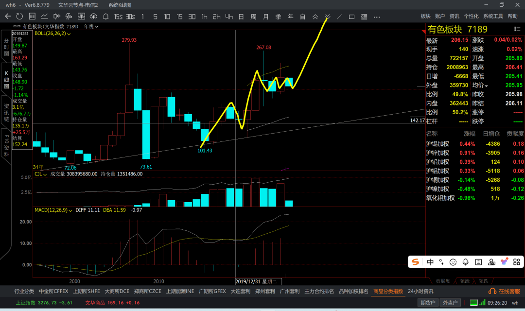 那么根据有色板块指数来看未来技术面会涨到哪里呢,大概需要多久的时间。