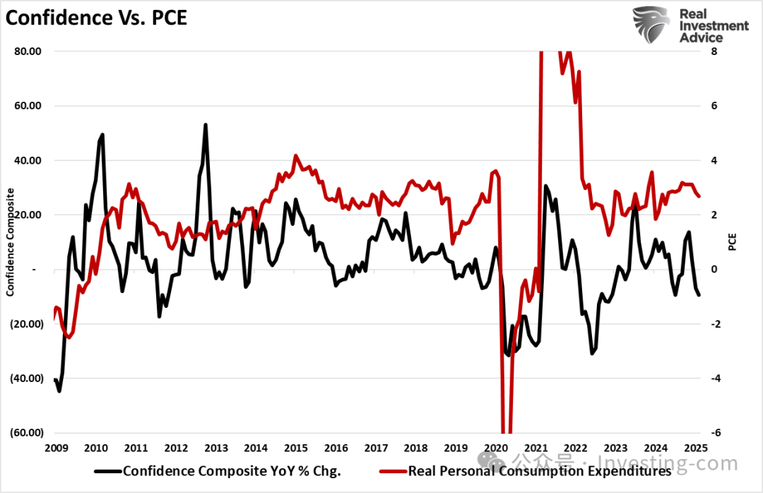 我们可以通过个人消费支出(PCE)进一步分析,这项指标占美国经济活动近七成。历史数据显示,消费者信心下降时,消费通常会随之放缓。