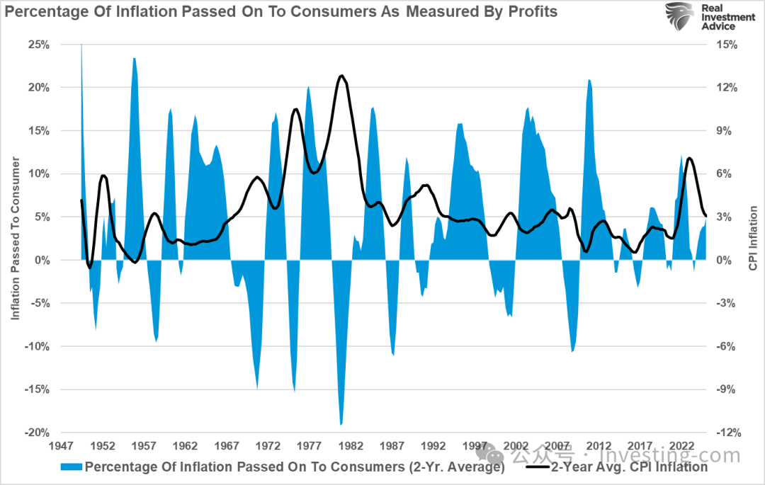 研究通胀风险时,消费者行为是关键因素。观察企业利润扣除通胀的两年平均值便可清楚看到这种影响。图中显示,关税等成本上涨只有转嫁到消费者身上才会推高通胀。2020年企业成功把大部分成本转嫁予资金充裕的消费者,造成通胀飙升。现时需求减弱,通胀降温,企业要承担更多成本,不但削弱盈利,也反映通胀正在放缓。
