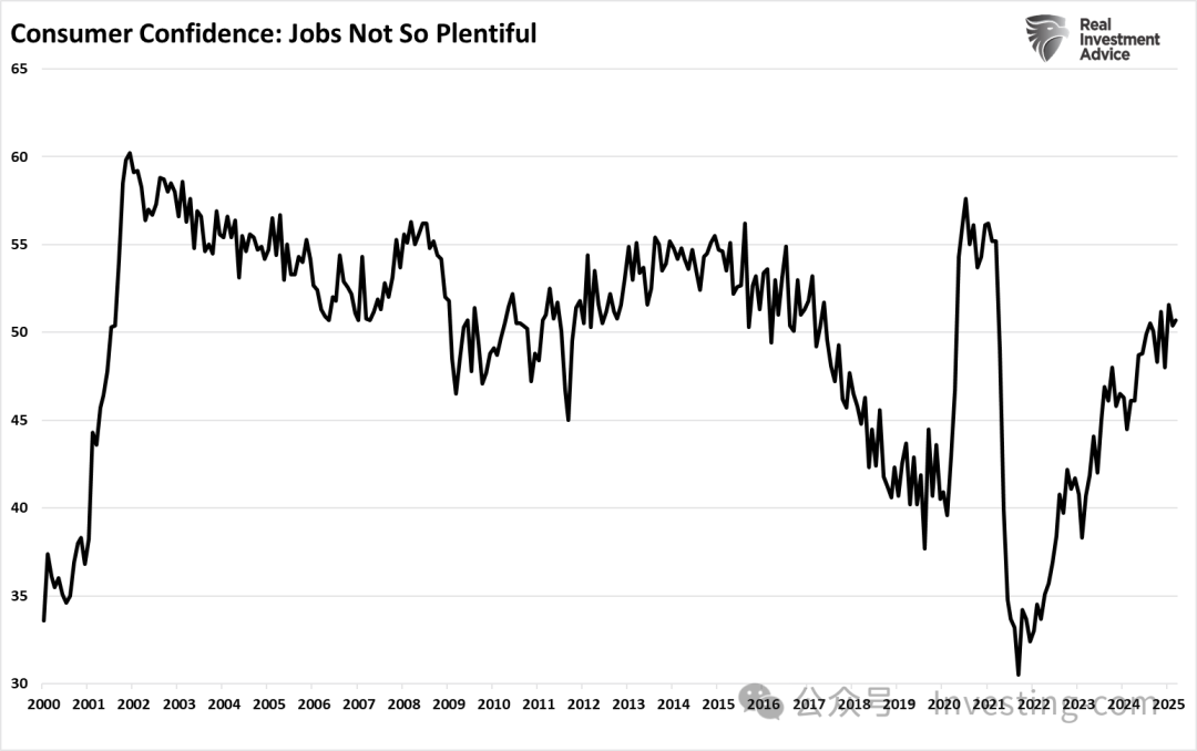 随着经济放缓,消费者对寻找就业机会的信心持续减弱。就业能带来消费所需的收入,若消费者失业、担心失业或工资增长停滞,消费(需求)便难以扩张。