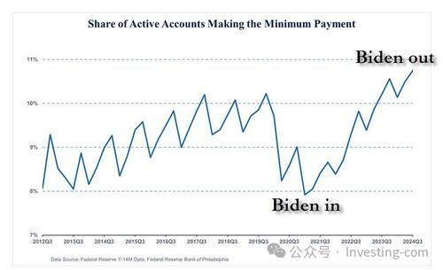 “问题核心在于中低收入家庭资产负债表恶化。这些群体已耗尽疫情期间积累的额外储蓄,转而依赖高息借贷度日。费城联储报告显示,2024年第三季度仅支付最低还款额的信用卡账户比例飙升至10.75%,创历史新高。这数字不仅反映信贷健康状况,更暗示现金流普遍紧张。”