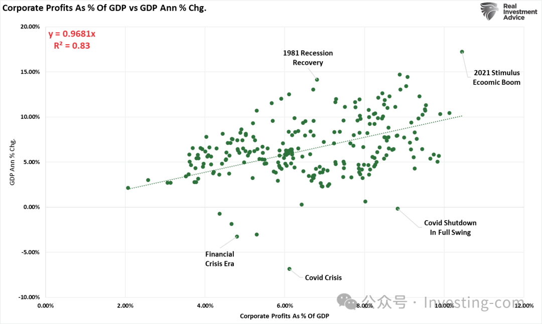 “疫后需求涌现、供应链中断,加上大规模财政及货币措施,令企业得以维持高利润。下图显示经济增长与企业盈利关系密切,只有在‘金融危机’及经济复苏等特殊时期才会出现脱节。”