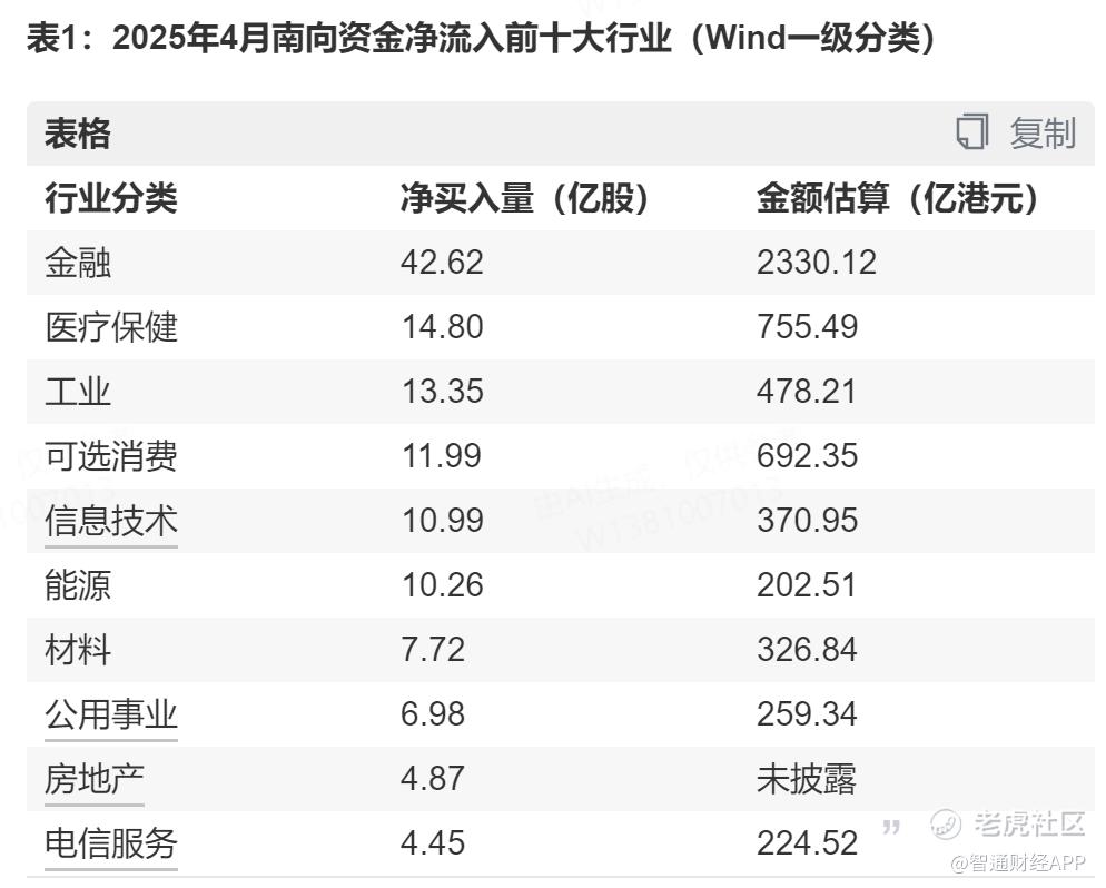 今年 4 月以来,南向资金流入前 10 的行业分布中,金融、医疗保健、工业、信息技术、可选消费占据前五名,其中医疗保健行业取代了原来信息技术行业的地位,成为了第二净流入的行业,净买入量达到 14.80 亿股。