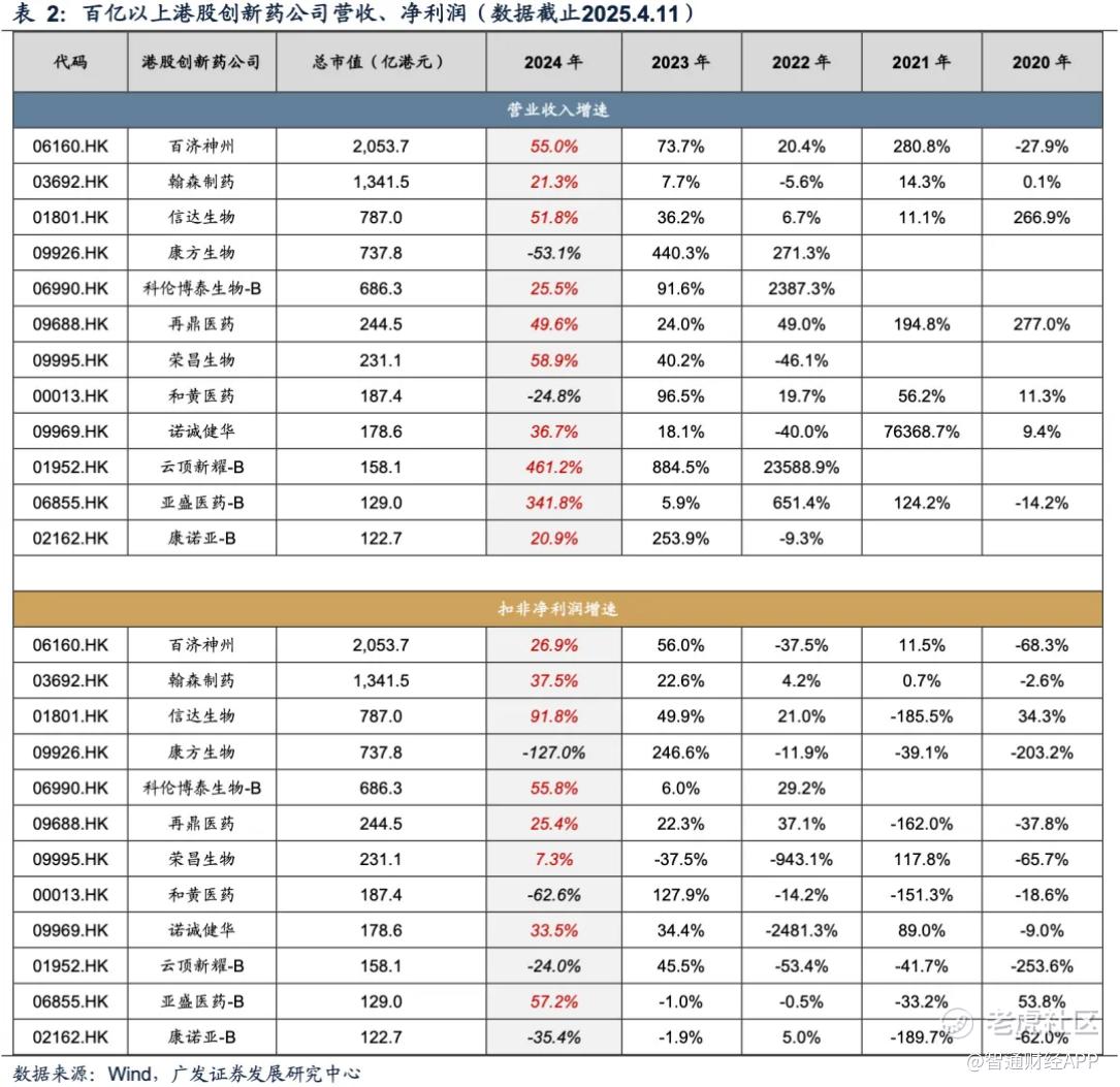 据广发证券统计数据显示,2024 年,12 家百亿市值以上规模的港股创新药企中 10 家营收增速为正,其中营收利润同为正增长的企业共有 8 家。其中营收增速最大的企业为云顶新耀 - B (01952),当期营收增速为 341.8%; 扣非净利润增速最大的企业为信达生物 (01801),为 91.8%。