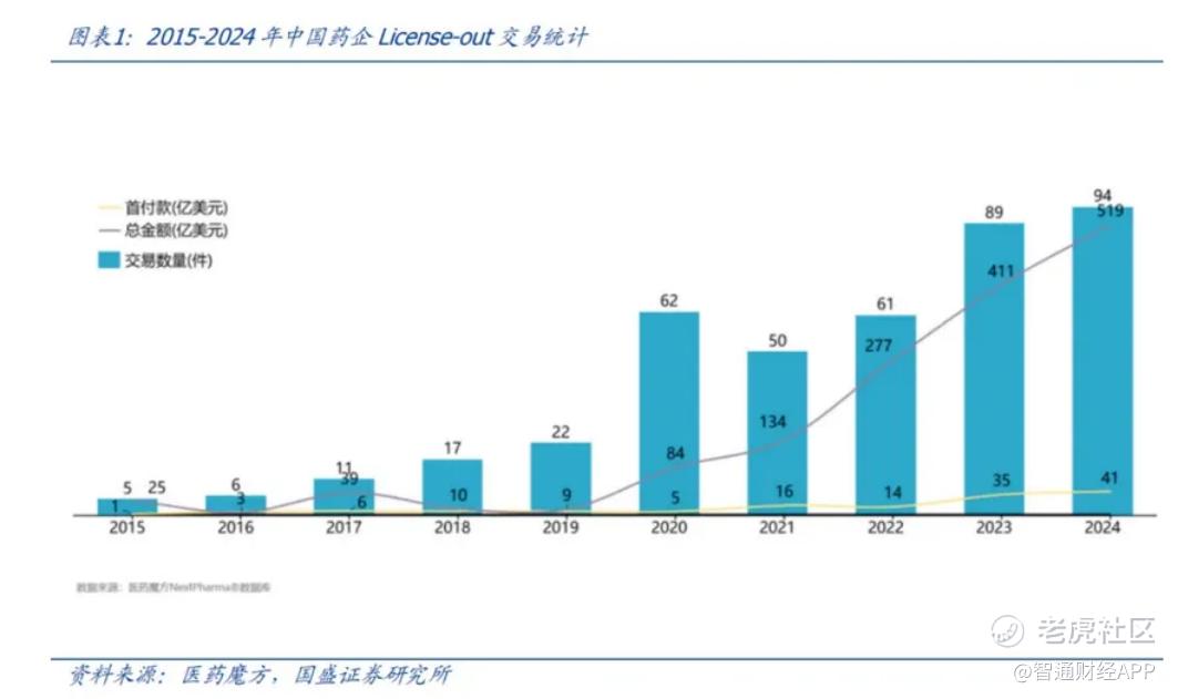近年来,中国药企在海外市场的 License-out 交易实现了跨越式发展,展现出中国创新药研发的全球竞争力。据动脉智库数据,2020 年创新药领域 License-out 交易额仅约 110 亿美元,2024 年中国药企的对外授权则创下历史新高,总交易金额达到了 519 亿美元。2025 年前两月的该项目金额已经超过 80 亿美元,进入了明显的收获期。