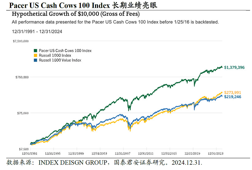 美国的自由现金流指数也不错,我们从图上看到,2000年时Pacer US Cash Cows 100 Index(美国现金牛100指数)没有70000点,到2024年末没有1400000点,差不多是20倍左右的收益。同期罗素1000指数也就4倍左右,查询到标普500指数也就5倍左右,纳斯达克100指数也就10倍左右。