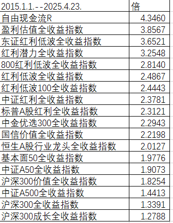 Smart Beta指数普遍有着十年翻倍以上的收益,如图。自由现金流R指数最好,中金优选300全收益指数也在翻倍以上。