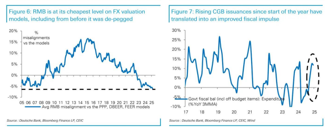 所有这些都表明,人民币中包含了 “武器化” 风险溢价。从长期来看,与 “贸易战 1.0” 时期不同,如今中国在面临经济 / 贸易冲击时,其货币处于明显低估状态。事实上,根据我们的外汇估值模型(DBEER、PPP 和 FEER)的平均值,人民币目前处于有记录以来的最低估值水平,甚至低于 2005 年 7 月汇率改革之前(图 6)。这主要是由于中国与贸易伙伴相比通胀持续处于低位,长期生产力提升,以及经常账户状况的改善。