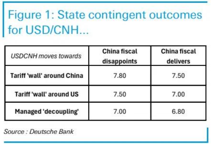 美国越是成功拉拢中国的主要贸易伙伴,将 “关税壁垒” 向中国推进,中国政策制定者就越有可能被迫或有意主动让人民币贬值。在另一种极端情况下,如果在 90 天的谈判期结束后,“关税壁垒” 如 “解放日” 关税计划那样向美国本土回撤,可能出现的结果范围最广。在这种情况下,美元兑人民币汇率的走势将受到结构性 “去美元化” 风险以及中美两国财政政策应对措施的共同影响。而 “有管理的脱钩” 情景将为上述因素推动美元兑人民币汇率下行提供最大空间。