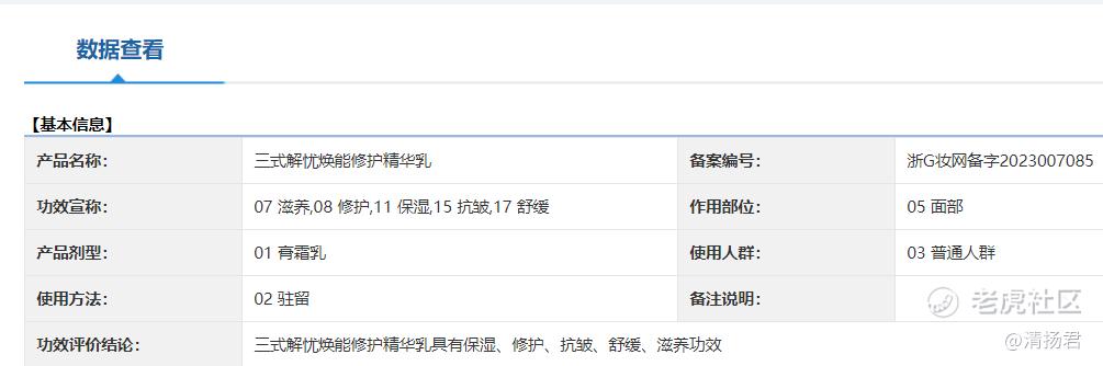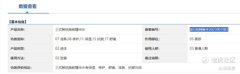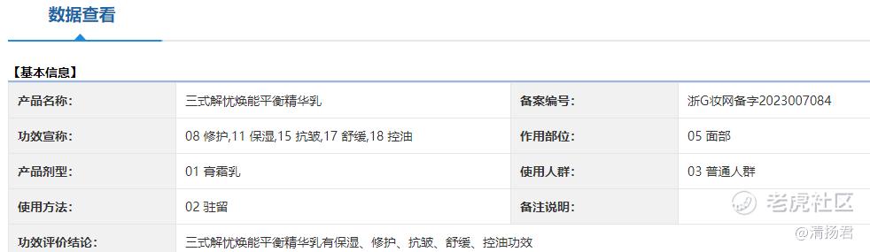 然而,通过查询药监局官网发现,该产品套装所涉及的“三式解忧焕能精华水”、“三式解忧焕能修护精华乳”和“三式解忧焕能平衡精华乳”,均为非特殊用途化妆品,备案的功效综合一起为“保湿、修护、抗皱、舒缓、滋养、控油”,并未提及“抗氧化”“抗老”“防蓝光”等功效,以及“孕妈妈、哺乳期适用”等新功效。也不得宣传“美白(抑制黑色素生成)”类特殊用途化妆品的功效。