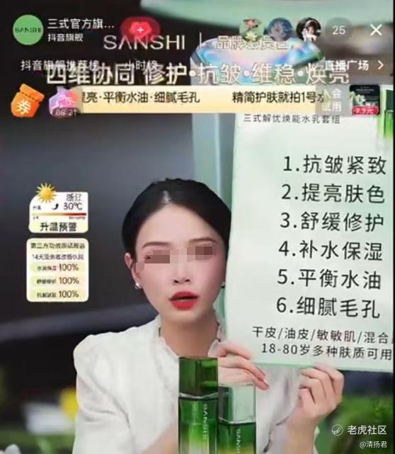 早在2023年9月,杭州三式在抖音平台“三式旗舰店”直播中,通过展示用户使用前后对比图,暗示“改善泛红”并宣称“受试者使用三式春光瓶14天/28天面部泛红改善明显”等具有功效断言的宣传内容,违反了《广告法》关于化妆品广告不得含有表示功效的断言或保证的规定,被杭州市拱墅区市场监督管理局依法对其处以3600元罚款。
