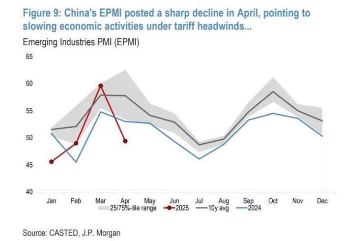 关税生效已近一个月,其对经济的损害可能比预期更快地在经济活动数据中显现。中国 4 月新兴产业采购经理人指数(EPMI)本月下降了 10.2 个百分点,降幅超过季节性水平(4 月为 49.4,3 月为 59.6),这是在关税不确定性下经济增长明显放缓的早期迹象。EPMI 与国家统计局 / 财新 PMI 类似,是一项基于调查的经济指标,主要关注中国的关键战略性新兴产业,包括绿色能源、生物技术、新能源汽车、新材料和高端制造业。EPMI 与国家统计局 PMI 之间的历史正相关关系,预示着下周发布的 PMI 数据存在不对称的下行风险。
