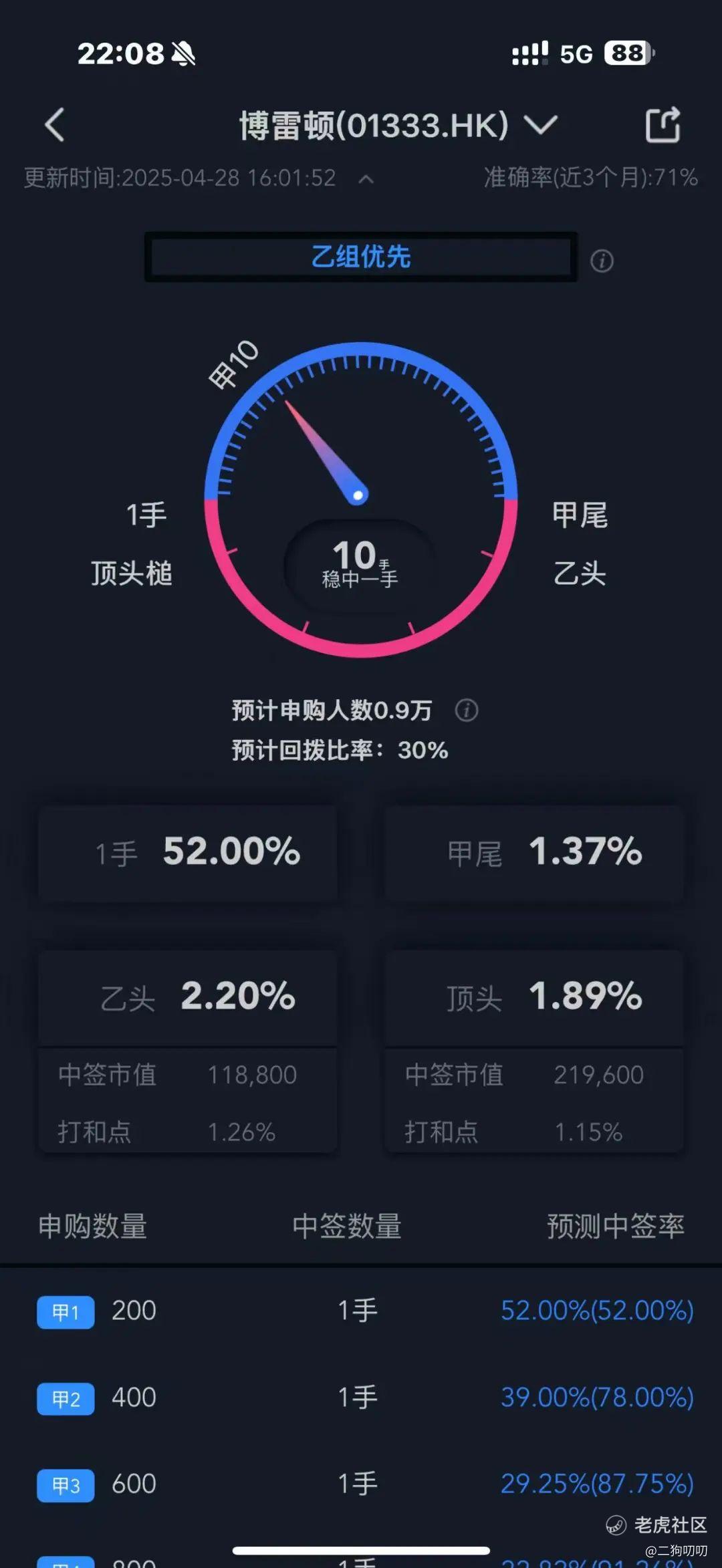 香港公开发售130万股,每手200股,合计6500手,目前孖展56倍,届时超过15倍,回拨40%,那么甲乙组各获13000手,按照9k人申购,预计1手中签率在50%,申购10手稳中一手。。。
