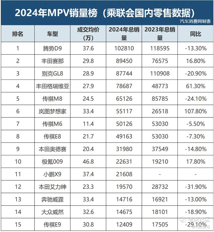 然而,在理想 MEGA 沉沦的一年中,市场竞争格局发生了巨大变化。2024年,比亚迪旗下的腾势D9, 以超过10万辆的成绩成为MPV年度销量冠军,是其继2023年取代别克GL8获得冠军宝座之后,再次摘得桂冠。