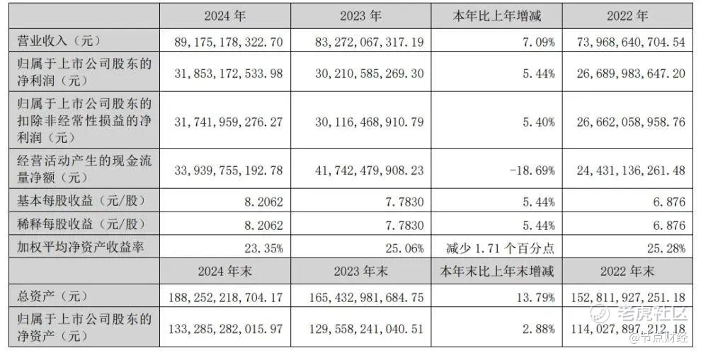 4月25日晚,五粮液发布了2024年度报告和2025年第一季度报告,数据显示,2024年,五粮液实现营业收入891.75亿元,同比增长7.09%;归母净利润318.53亿元,同比增长5.44%。2025年一季度,公司实现营业收入369.40亿元,同比增长6.05%;归母净利润148.60亿元,同比增长5.80%。