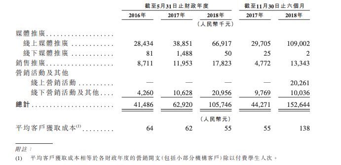 根据聆讯资料,新东方在线的付费学生人次逐年增多,截止2018年11月30日,新东方在线在6个月里的付费学生人次达110.4万名,已超过了2017财年的总付费学生人数。但与此同时,公司的获客成本却出现了大幅度增加。
