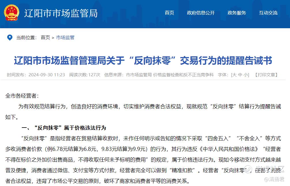 市场监管局还表示:现如今移动支付方式越来越普及便捷,消费者通过微信、支付宝等方式付款,经营者完全可以做到“精准扣款”。经营者“反向抹零”,侵害了消费者合法权益,违背了市场公平交易的原则,破坏了商家和消费者平等的消费关系。