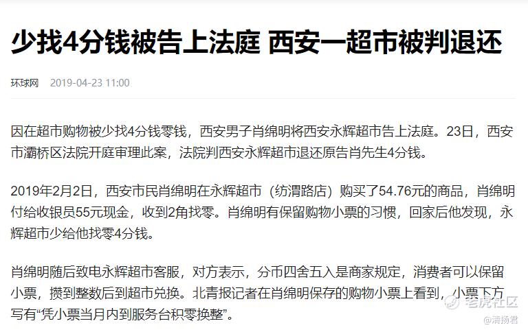 2019年2月,西安市民肖绵明在永辉超市购买54.76元商品,支付55元现金后仅找回0.2元,被“四舍五入”克扣4分钱。这位较真消费者保留小票起诉超市,小票上“凭票积零换整”的条款成关键证据——法院认定此举属单方面“霸王条款”。