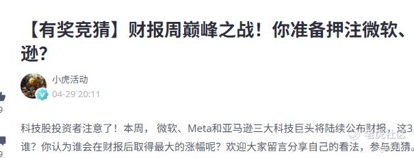 这个刺激的财报周,微软、Meta和亚马逊三大科技巨头将陆续公布财报,小虎老师在问大家准备押注哪一家巨头。