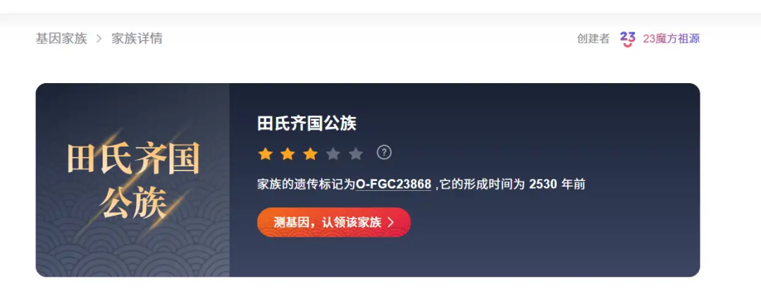 现代基因检测显示,田氏齐国公族,家族基因标记为 O-FGC23868,共祖时间约在2530年前,推测为战国时期齐国国君妫姓田氏一族。据统计,如今该家族后裔已广泛分布于全国,约**国男性人口的0.46%。