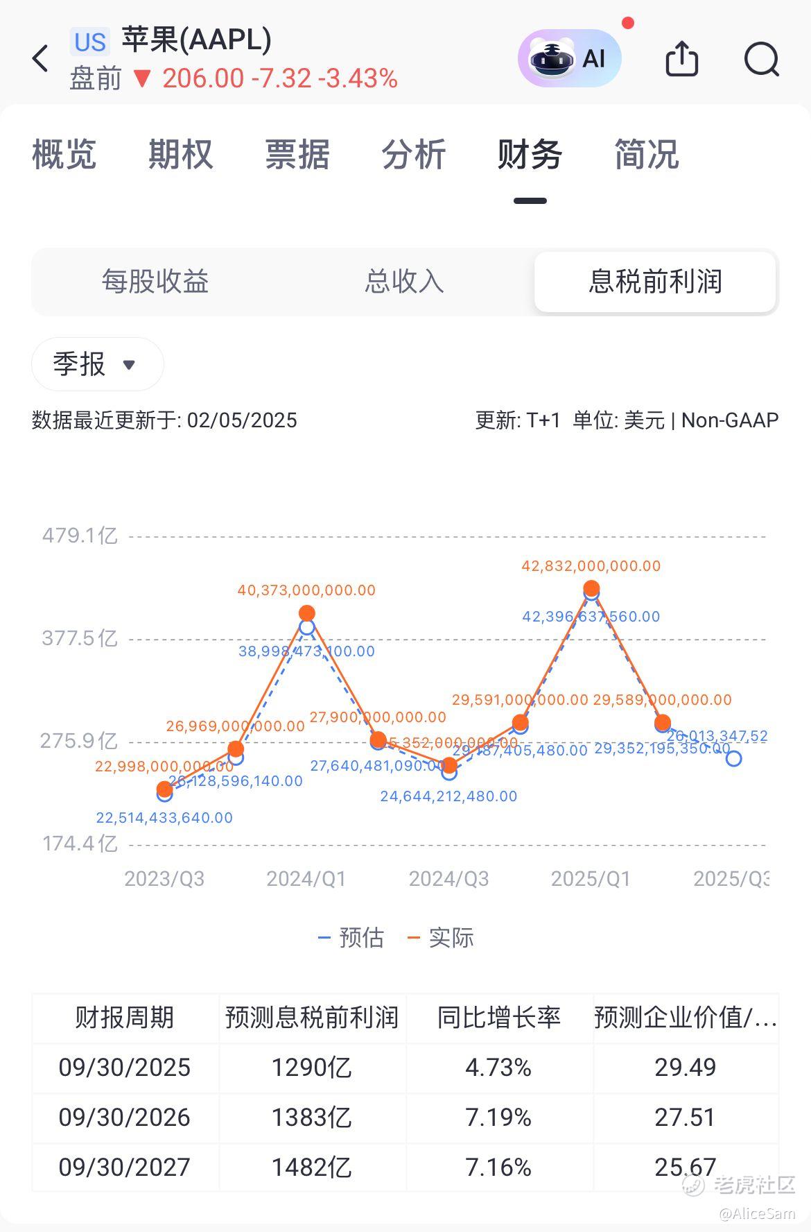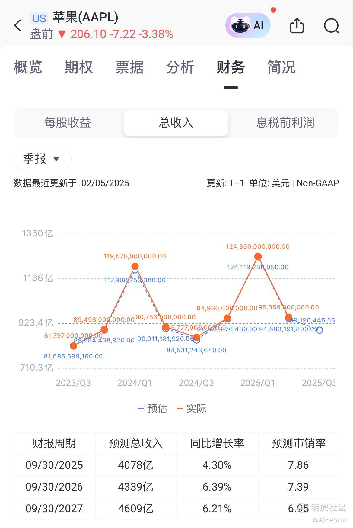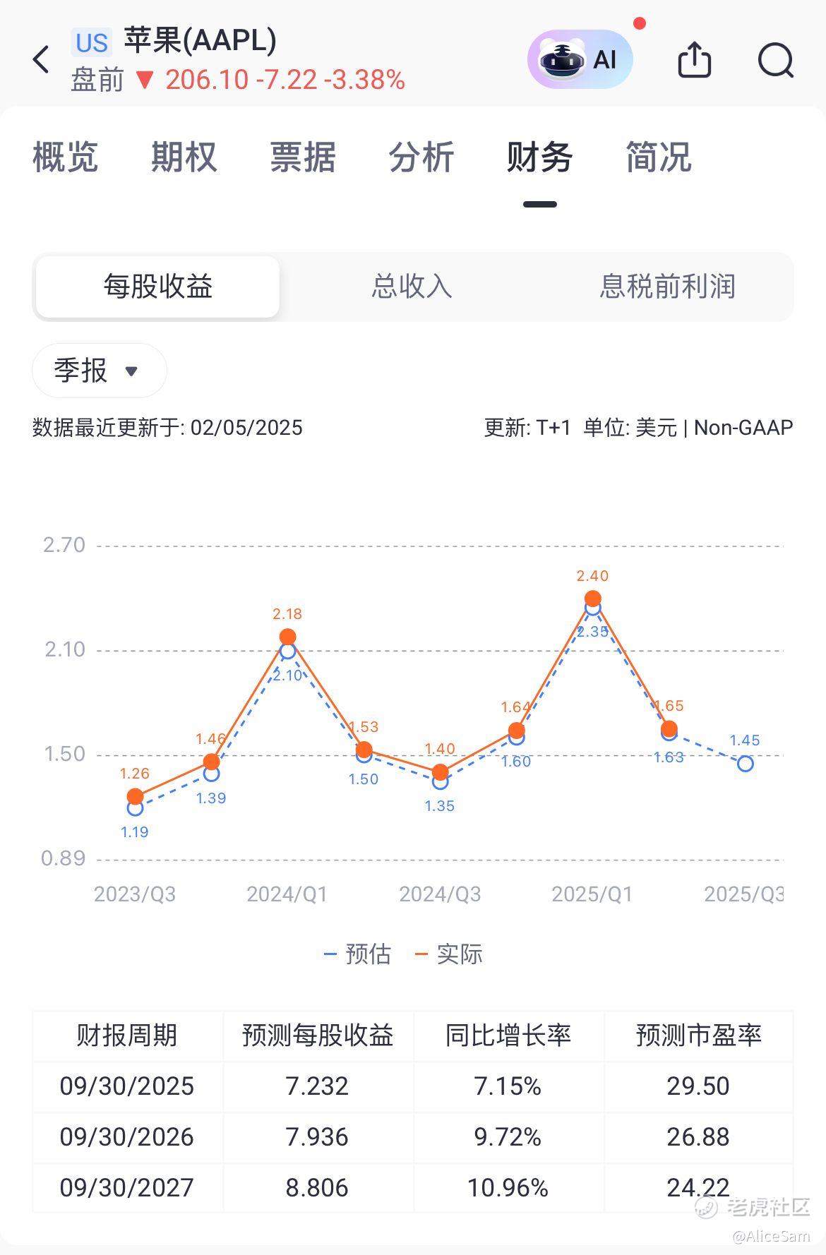看了收入,再看他们的每股收益(EPS),每股收益为1.65美元,同比增长8%,同样高于市场预期的1.63美元。但是如果我们从老虎个股页面的这个对比图看,这个季度和下个季度的预期,是一个非常明显的大滑坡,跌下来的不是一星半点哦。不过,苹果宣布了一项新的股票回购计划,授权回购高达1000亿美元的公司普通股。这表明苹果对自身业务的信心,同时也为股东提供了价值回报。苹果董事会宣布每股0.26美元的季度现金股息,较上一季度增长了4%。股息支付日为2025年5月15日,股权登记日为2025年5月12日。