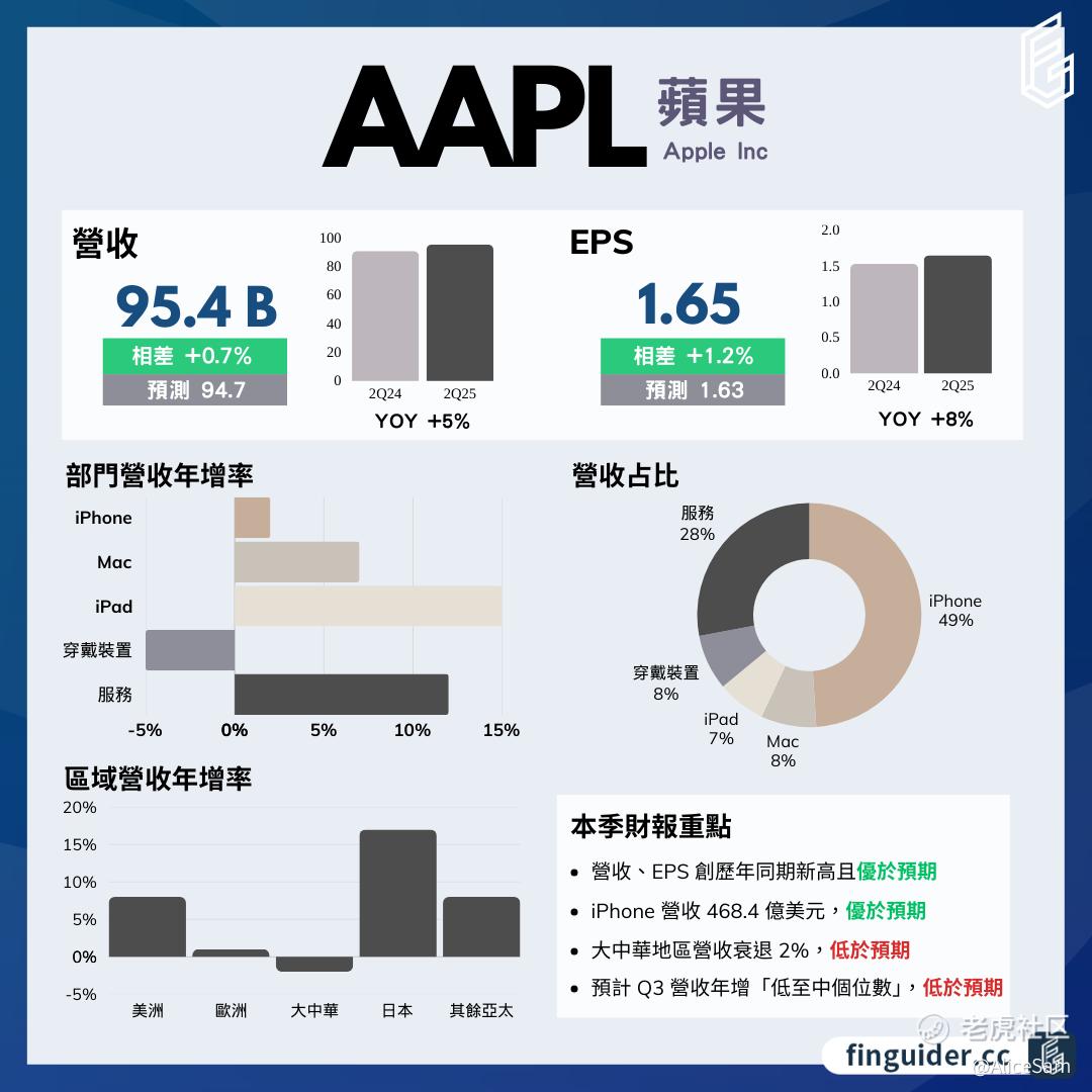 刚好看到苹果发财报了,赶紧去看看去 [暗中观察] 不一定为娘的好好学习一下,有好机会去买些苹果Call,赚回小姑娘的一台iPhone 17呢 [贱笑] 从下面这份财报总结图来看,数据一眼看过去,都是很积极正面的,应该是有些希望的。