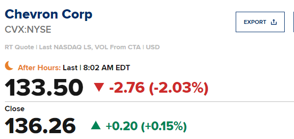 Chevron (CVX)第一季度每股收益为2.18美元,比市场预期值2.16美元高出0.02美元;营收同比下降2.3%至476.1亿美元,市场预期值482.5亿美元。