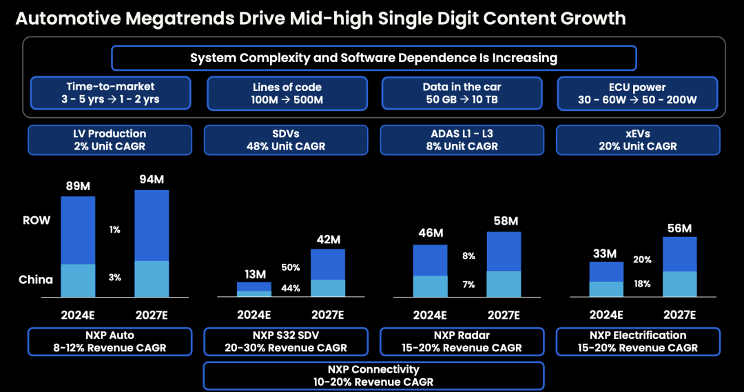 汽车业务占比接近60%,依旧是支柱,短期内受下游库存调整影响,但在向SDV(软件定义汽车)演进的趋势中,NXP以S32平台为核心的战略优势正逐步显现。