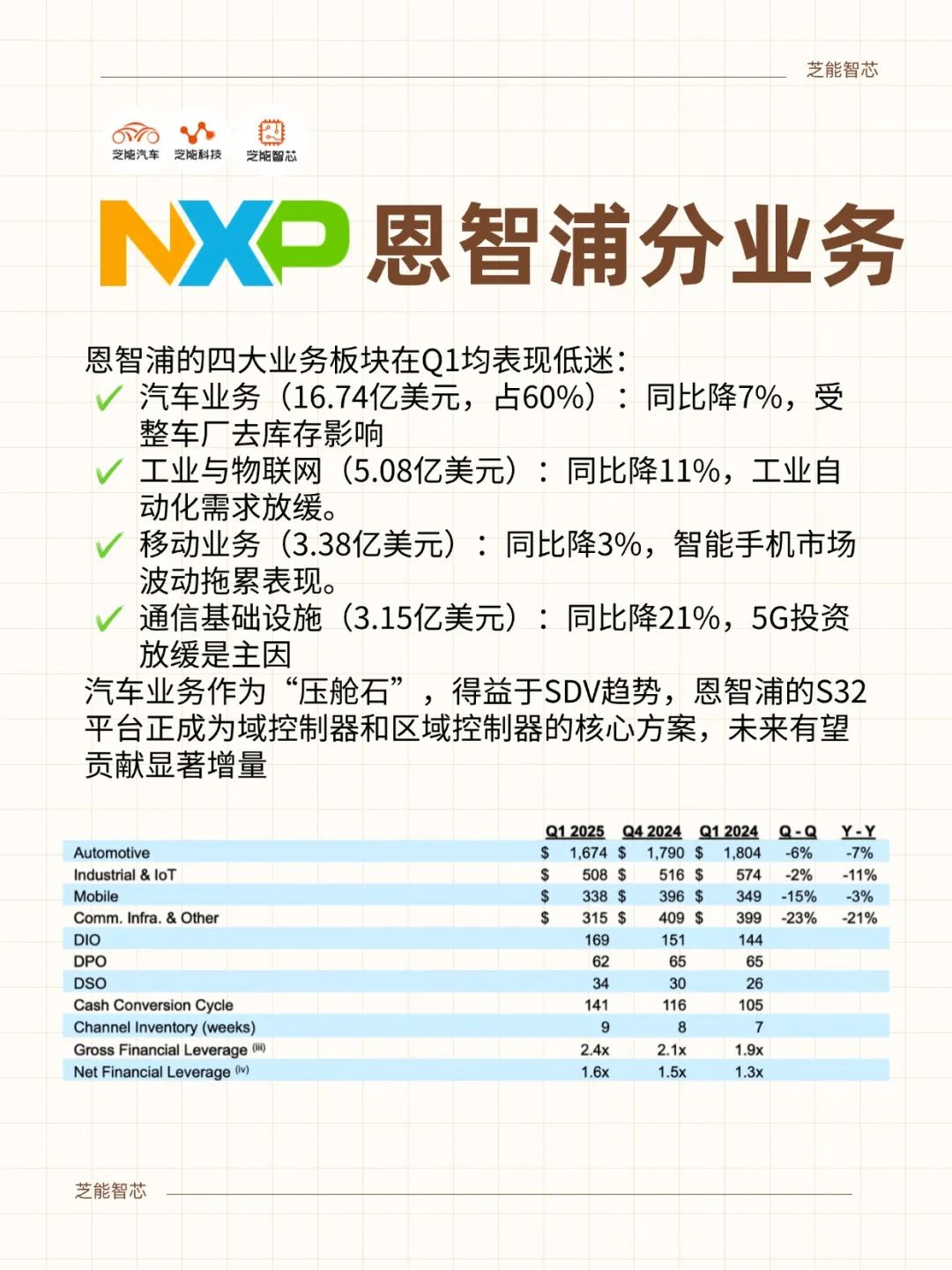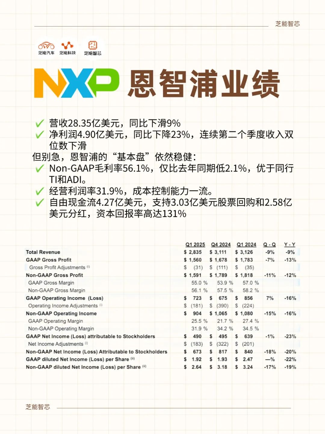 总体而言,NXP在2025年Q1交出了一份“基本面稳健,转型持续推进”的成绩单。面对行业逆风,其保持了强劲的盈利能力和现金流,技术与产品迭代未受宏观波动影响。