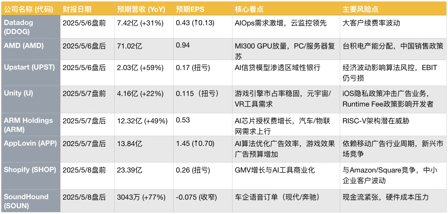 在 $美国超微公司(AMD)$、 $Datadog(DDOG)$ 、 $ARM Holdings(ARM)$ 、 $AppLovin Corporation(APP)$ 、 $SoundHound AI Inc(SOUN)$ 、 $Upstart Holdings, Inc.(UPST)$ 、 $Unity Software Inc.(U)$ 、 $Shopify Inc(SHOP)$ 中,你认为:谁的财报最可能超预期?谁会在财报后涨幅最大?