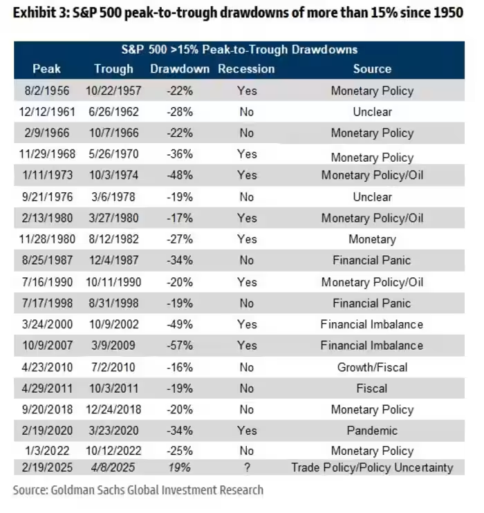 高盛宏观策略师 Vickie Chang表示:可能尚未触底,市场无法明确追踪下跌的来源,基于过去超过15%的抛售数据,当前的下跌幅度(-19%)已符合“典型回调”的门槛,如果是受外部冲击,类似“关税”,那么市场可能已经见底,但如果是由经济基本面疲软所导致,那必须等到经济数据稳定才可能止跌。[吃瓜]
