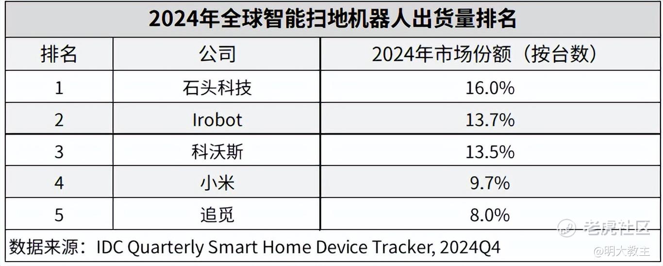 IDC在《全球智能家居设备市场季度跟踪报告—2024年第四季度》中披露,全球智能扫地机器人市场2024年出货2060.3万台,同比增长11.2%;销售额有93.1亿美元,同比增长19.7%。石头科技2024年出货量同比增长20.7%,销量首度超过iRobot。2024年石头以16%的销量份额/22.3%收入份额的成绩,首次晋升全球销量、销售额口径“双冠王”。