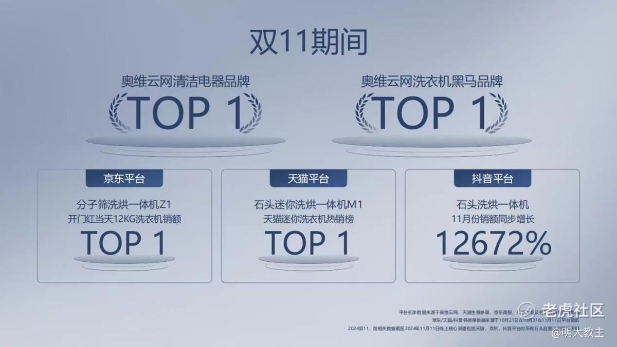 去年“双十一”期间,石头科技升至洗烘一体机TOP 3品牌,并成为1公斤级轻量洗衣机单品冠军。