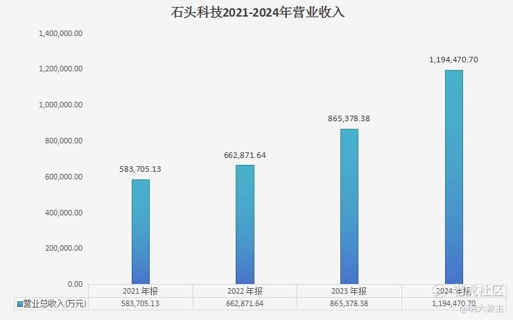 $石头科技(688169)$ 2024年营业收入119.44亿元,同比增长38.03%。近四年石头科技营收翻倍,年化复合增速27%。