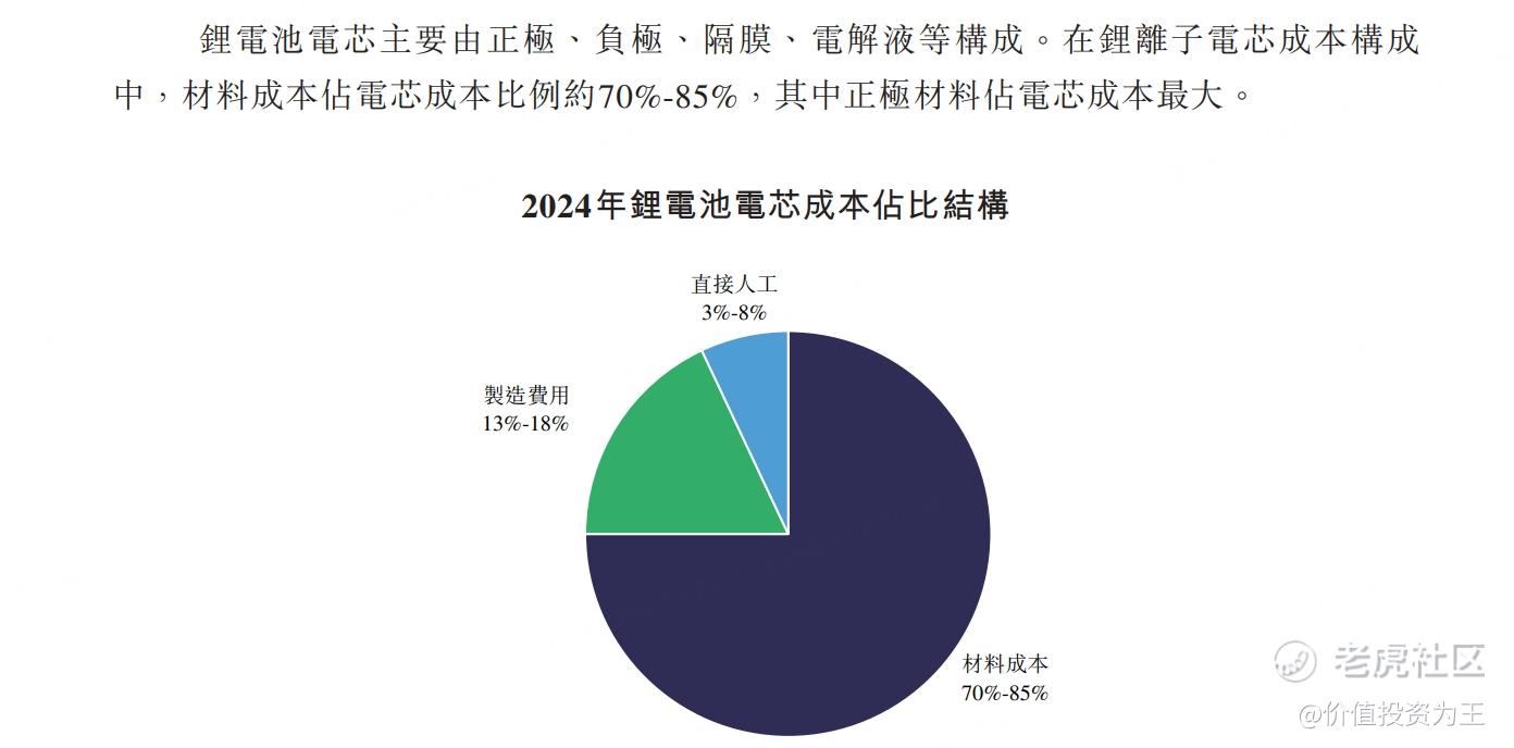 电芯主要由正极、负极、隔膜、电解液等构成。在锂离子电芯成本构成中,材料成本占电芯成本比例约70%-85%,其中正极材料占电芯成本最大: