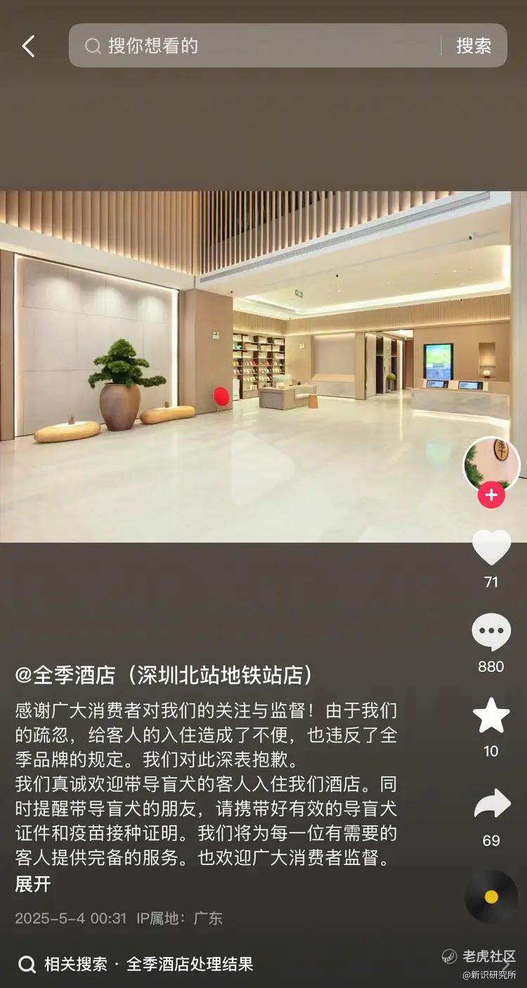 事后该酒店发视频进行道歉,称“我们真诚欢迎带导盲犬的客人入住我们酒店。同时提醒带导盲犬的朋友,请携带好有效的导盲犬证件和疫苗接种证明。我们将为每一位有需要的客人提供完备的服务。也欢迎广大消费者监督。”