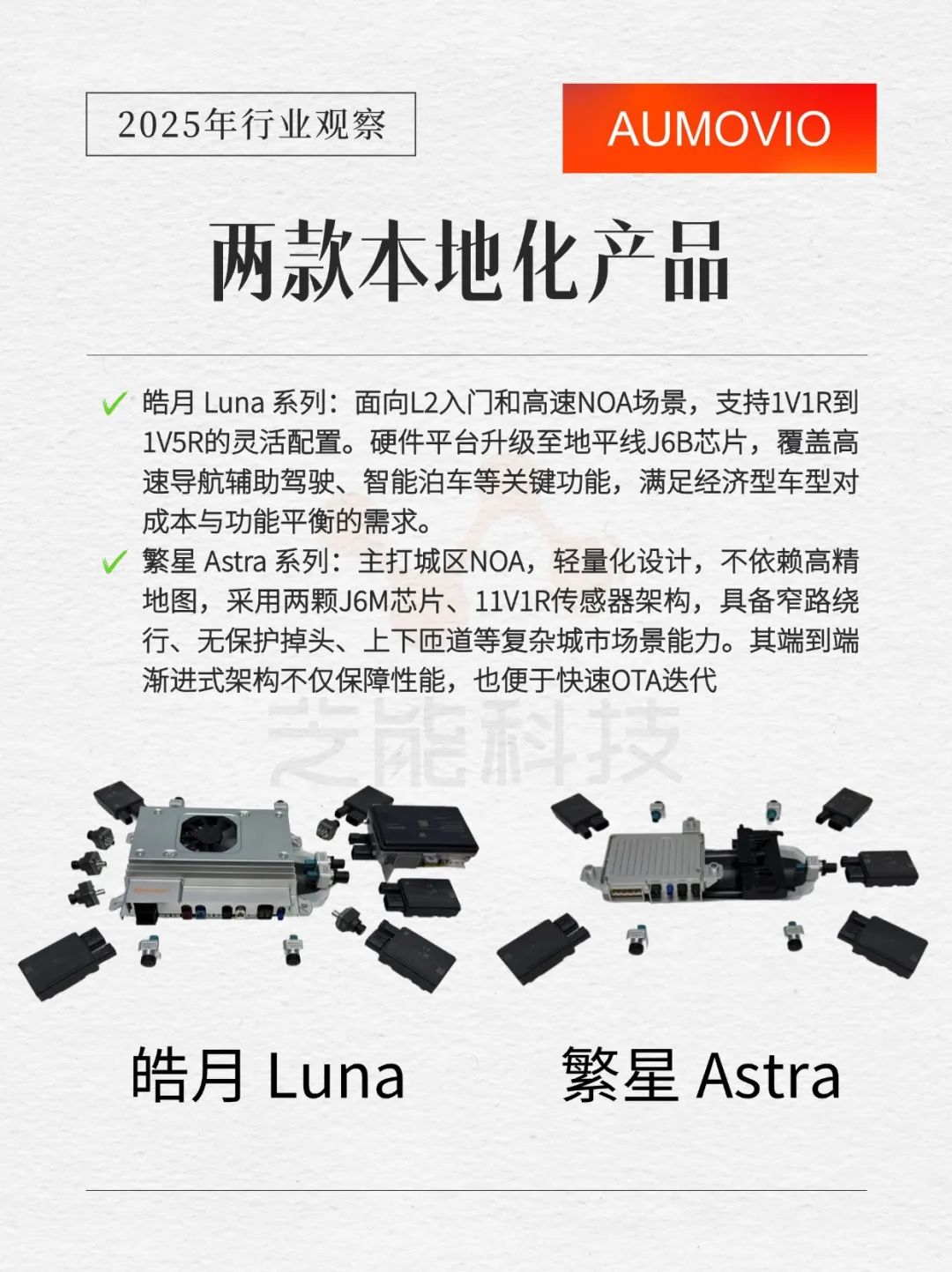 ◎ 皓月 Luna 系列:面向L2入门和高速NOA场景,支持1V1R到1V5R的灵活配置。硬件平台升级至地平线J6B芯片,覆盖高速导航辅助驾驶、智能泊车等关键功能,满足经济型车型对成本与功能平衡的需求。