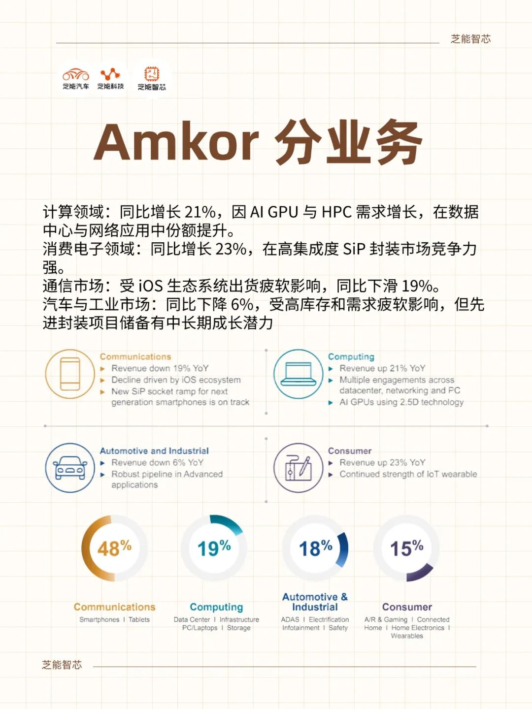 ◎ 汽车与工业市场同比下降6%,受到高库存和需求疲软影响,但Amkor在先进封装(如高可靠性封装、功率模块封装等)方面的项目储备仍具中长期成长潜力。