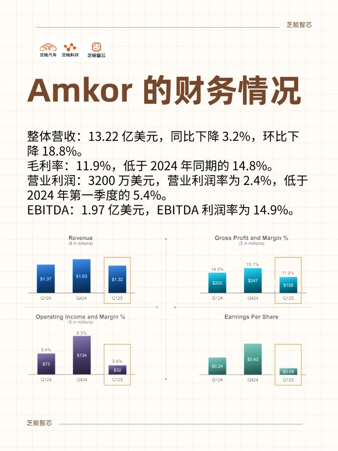 Amkor (安靠科技)作为全球领先的半导体封装与测试服务提供商,在2025年第一季度面对全球宏观经济不确定性、智能手机出货疲软以及汽车和工业市场库存压力的多重挑战下,表现还是很不错的。