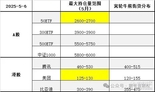 下图是富婆总结的,今天大A的3个ETF和一个指数,以及港股的腾讯、美团和比亚迪的最大持仓量范围以及窝轮牛熊分布范围,也就是5月的资金筹码分布,黄色的表示跟上个交易日有变动。