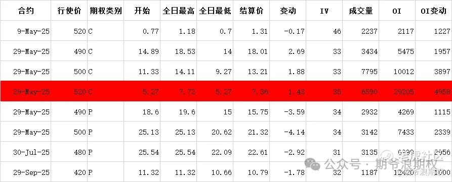 节前最后一个交易日4月30日,5月510购大增1.1W张,下图是今天期权持仓变化,红色是增仓较大的仓位,5月520购增仓4900张。今天已经涨到接近500的位置,估计最多涨到520或者530就会有阻力。