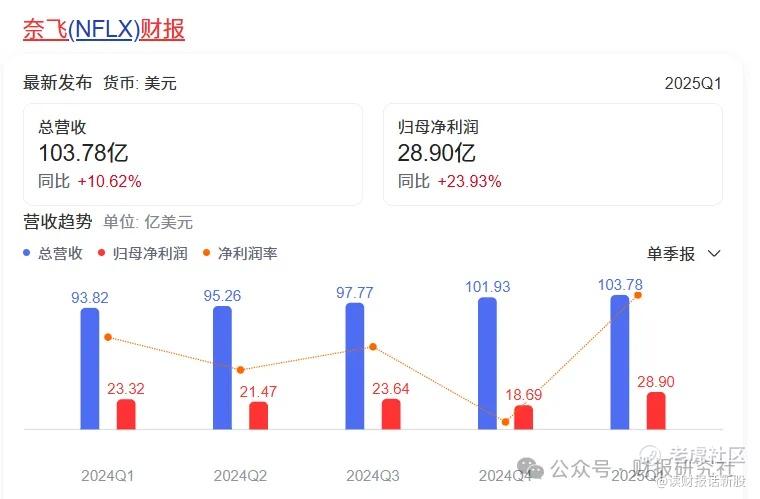 最让人意外的是净利润,原本大家估计在23-24亿之间,结果直接干到28.9亿,比去年同期暴涨将近24%。现在科技股都不太景气,但奈飞这个流媒体老大好像完全不受影响。